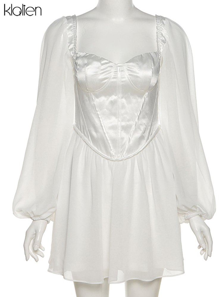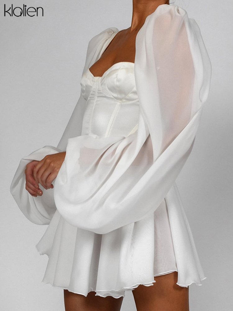 KLALIEN Women Fashion Elegant High Waist Slim Solid White Office Lady A-Line Mini Dress 2022 Spring Autumn New Women Party Dress